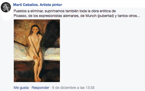 Mi sorpresa fue cuando Pedro Lezcano me avisó que mi comentario y mi foto habían sido eliminados por facebook. Al principio no me lo podía creer ya que en mi muro yo sí que podía verlo. Me temí que únicamente podía ser yo el que lo viese, ya que era el que lo había publicado, e intenté averiguarlo desde otro navegador. Efectivamente, mi comentario y foto habían sido eliminados, pero facebook, muy hábil y engañosamente, permite que el propio autor vea su comentario pero no, si ellos así lo creen oportuno, los otros usuarios. En fin, quería denunciar esta censura tan absurda, ya que como os podéis imaginar este cuadro tan «censurable» de Munch, Pubertad, al igual que “Thérèse Dreaming” de Balthus, circulan en google extendidos como «malignos virus». Por lo que he podido averiguar facebook tiene problemas con los algorritmos robóticos que han de decidir si un desnudo es pornográfico o artístico. Si Modigliani ya tuvo problemas con los desnudos en una exposición en 1917, ahora 100 años después los tiene con un vídeo de sus desnudos subido a facebook en 2017. Ver para creer. Leed, leed…