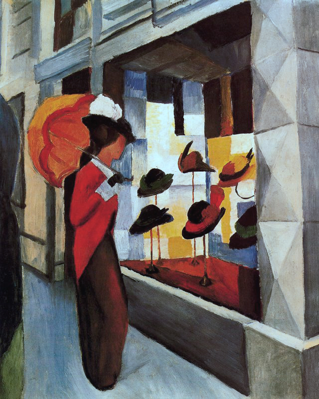 Sombrerería, August Macke, 1914. Se puede observar aquí como la abstracción y la figuración descriptiva se fusionan en perfecto equilibrio y de forma natural.
