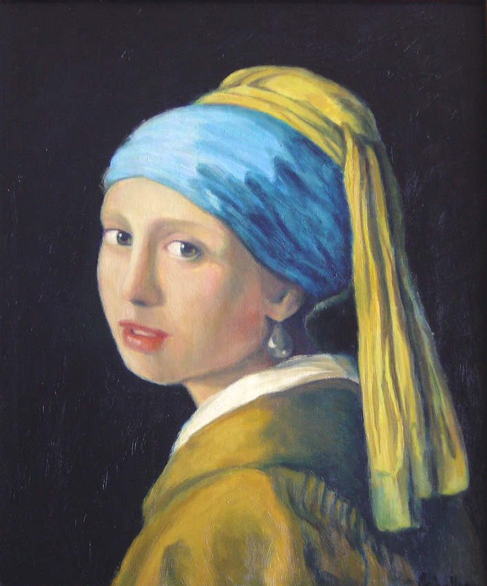Este fue el único cuadro que copié de Veermer. No puedo informarle de los precios de las copias pues no soy entendido, yo vendo mi propia obra. En cuanto a los precios dependerá del tamaño y del tiempo que se haya invertido en esa copia pues cada cuadro tiene sus dificultades. (las obras de Veermer están muy trabajadas, él estaba meses para realizarlas) También dependerá del artista que la realice y como se cotice. Para saber si es una buena copia dependerá del grado de entendimiento que el coleccionista tenga sobre pintura. Lo ideal seria ver la copia del natural.